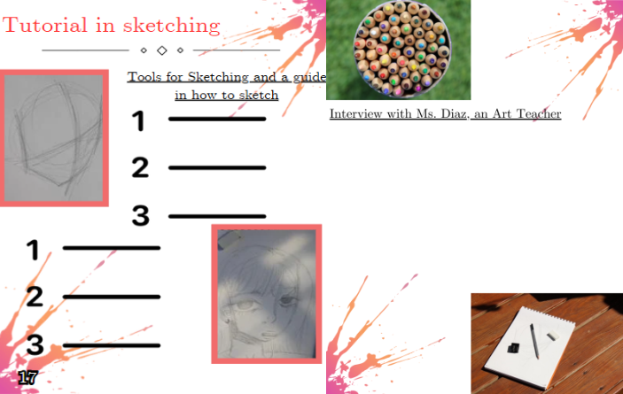 I used "Canva" as my program to make these. Again, to go with the homestyle I put in paint splashes in opposite corners. Then to match the colors, the title is in a pink/orange color. For the left page, the photos of the sketching are put on top of each other on the left with an arrow pointing down between them meaning the top is the before and the bottom are the results. The article is put on the right side of the photos in two stanzas. The second page is left unfinished since it's still a work in progress. I do have to interview results, so I just need to figure out to set out the photos with the text.